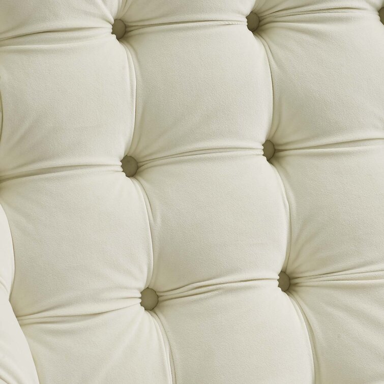This 34″ wide lounge chair has classic button-tufted designs and a curved seat for the right amount of mid-century modern glam in your living room or foyer. Its frame is crafted from engineered wood, and built on flared legs in a natural birch finish with gold-capped feet. This chair has a wide, square back with recessed arms and an angled seat, all filled with foam and upholstered in velvet and polyester for a textured place to sit during movie night. Plus, the feet on this chair have non-marking caps that prevent scratches on your floor. This chair supports up to 331 lbs.